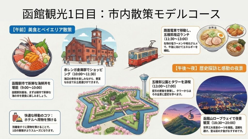 函館を1泊2日で楽しむためのおすすめプランを紹介します。効率よく観光スポットを回りつつ、函館の魅力を満喫できる内容になっています。混雑具合にもよりますが、私はこのプランで楽しめました。