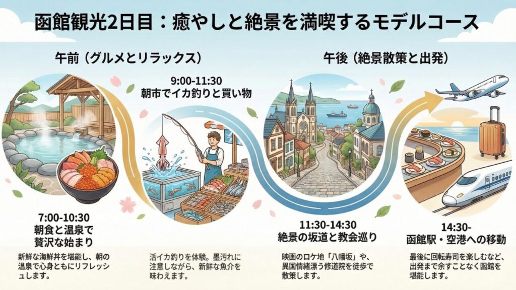 ホテルの温泉を朝から楽しむと、夜とは違った景色を堪能できます。チェックアウト後なら、湯の川温泉へ行くのもおすすめです。足湯や日帰り温泉でリラックスし、疲れを癒しましょう。函館空港近くなので、後に回しても。 - 朝市でお土産購入とイカ釣り(9:00〜11:30)